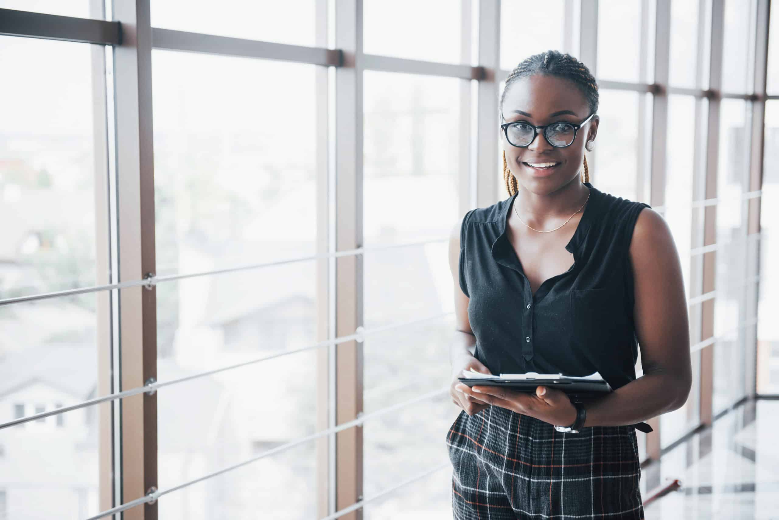 A thoughtful African American business woman wearing glasses holding documents.